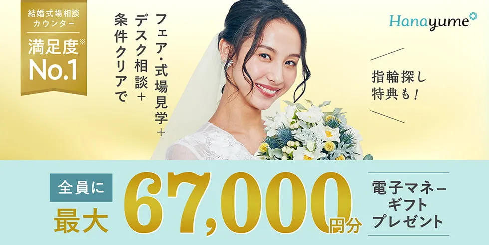 | ハナユメ | 結婚式場紹介 | アマギフ最大 67,000円分 | 式場見学 | 詳細を見る | |