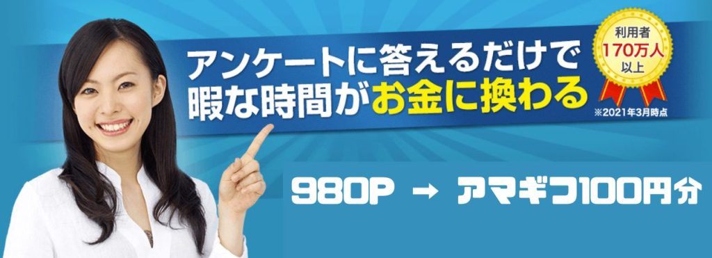 | リサーチパネル | モニター | 980pt →アマギフ100円 | アンケート回答 | 詳細を見る | |