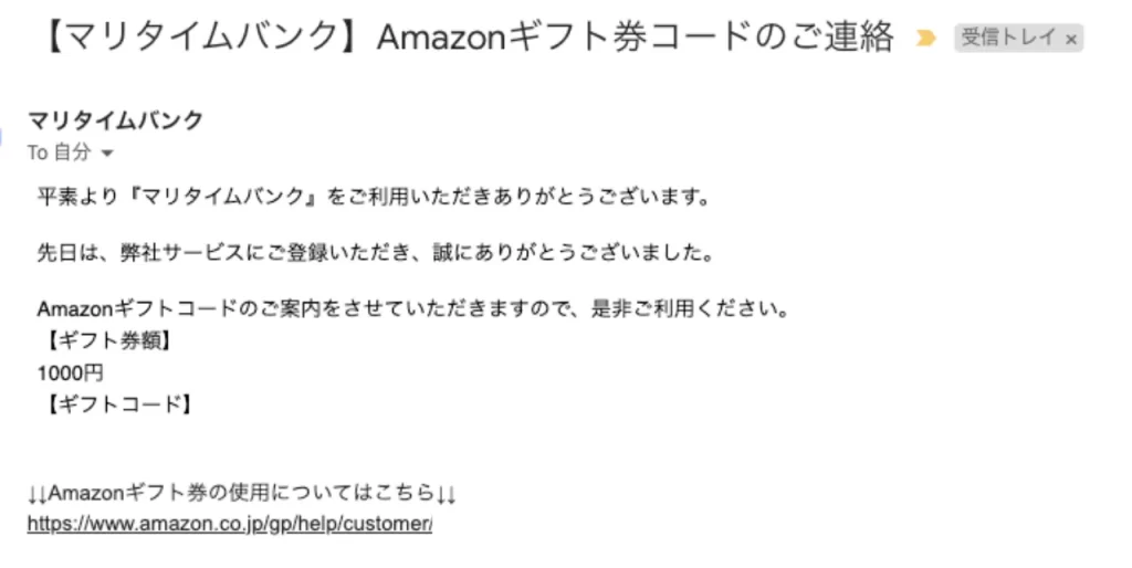 - マリタイムバンクに会員登録が完了すると1,000円分のアマギフが貰えます。