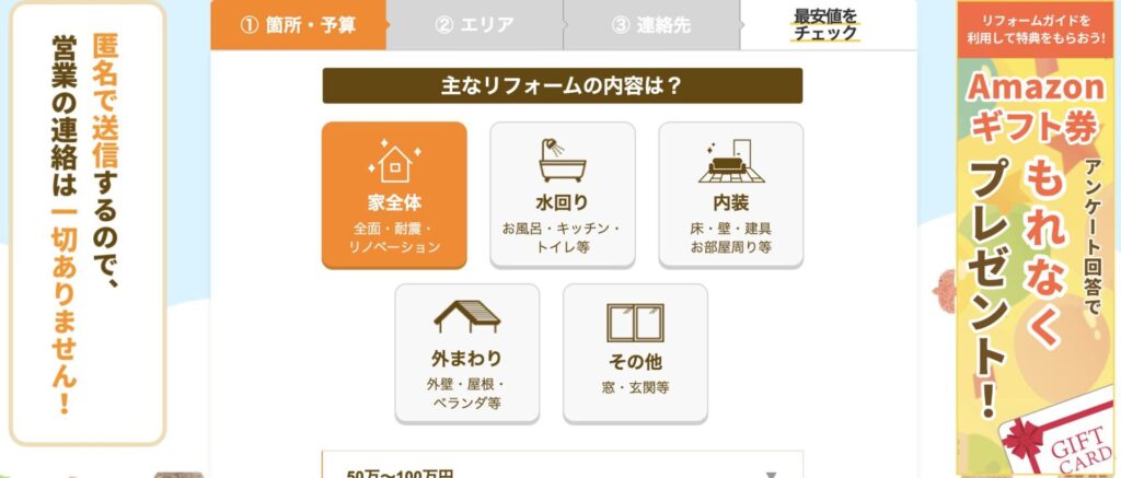 | リフォームガイド | リフォーム見積り | 500円分のアマギフ | 比較見積もり | 詳細を見る | |