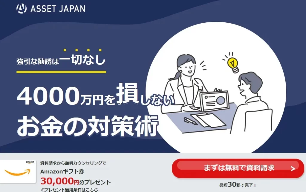 アセットジャパンに「不動産投資の資料請求」と「個別面談」を受けた方に30,000円分のAmazonギフト券をプレゼントするキャンペーンを実施中。