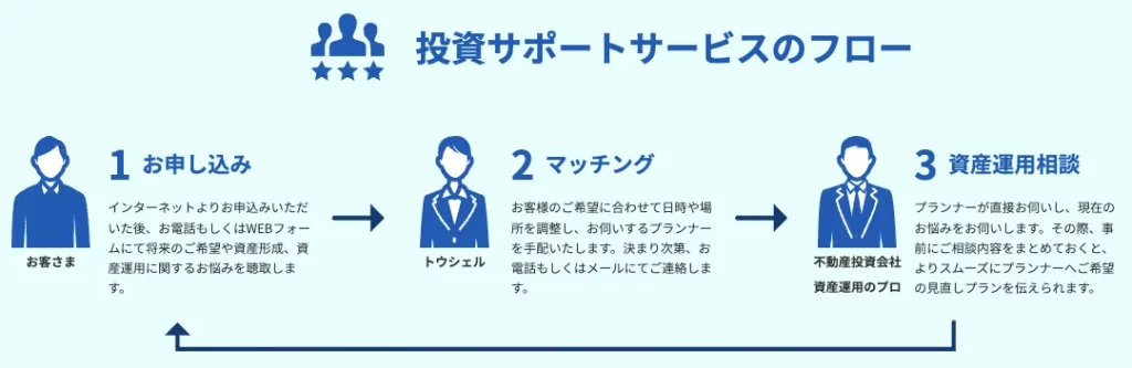 トウシェルのスタッフが顧客からのヒアリングから「適切な投資会社」を紹介してくれるサービスです。